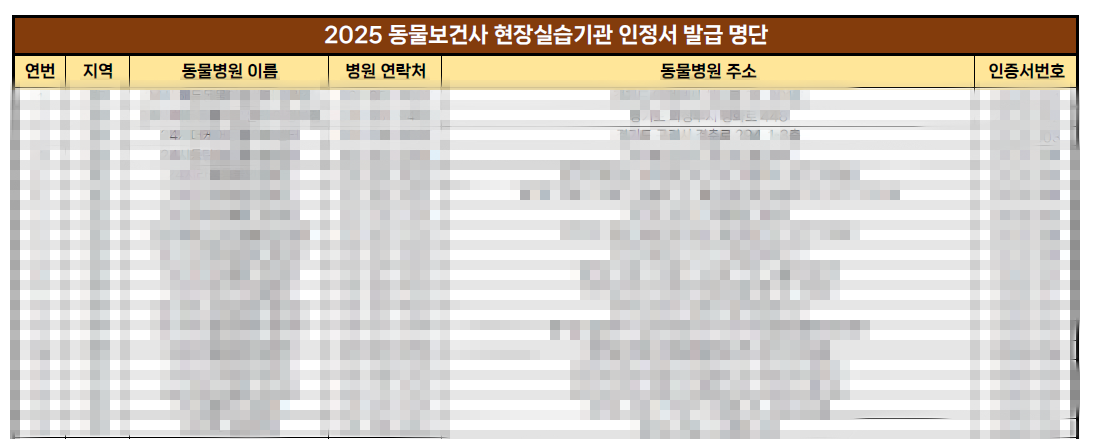 2025.12.01 동물보건사 현장실습기관 인정서가 발급된 동물병원(258개소)을 안내드리오니, 첨부된 파일을 확인하여 주시기 바랍니다. (인정기간~'26.11.30.)