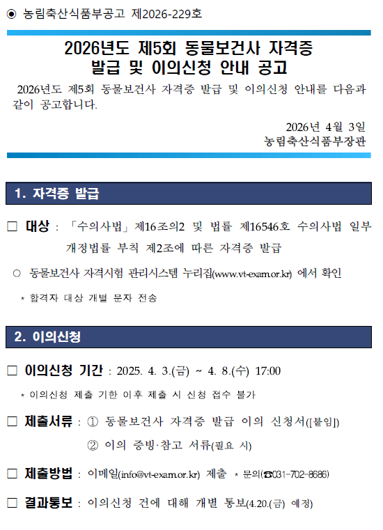 2026년도 제5회 동물보건사 자격증 발급 대상자 및 이의신청이 안내되었으니, 첨부된 공고 및 붙임파일을 확인하여 주시기 바랍니다.